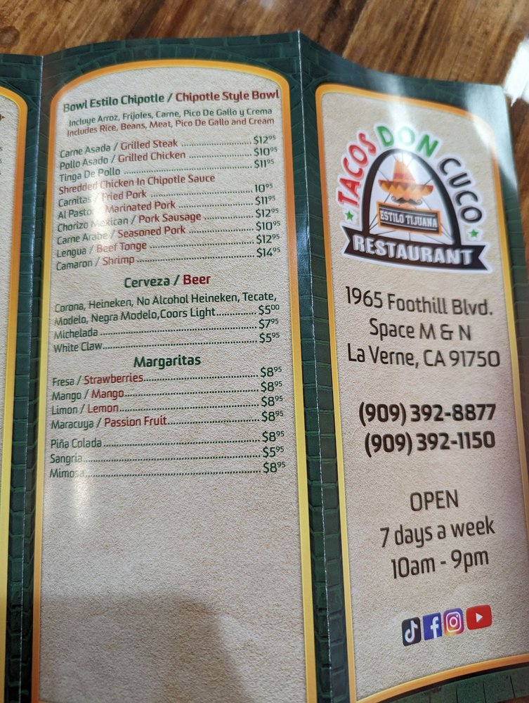 Welcome to Tacos Don Cuco, a vibrant haven for taco enthusiasts nestled in La Verne, CA. This establishment specializes in authentic Mexican cuisine, offering a diverse menu that highlights the beloved Birria de Res Estilo Tijuana. Signature dishes include tacos de birria, mulitas, and tostadas, all bursting with rich flavors and lovingly prepared.